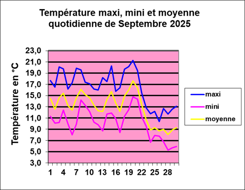 Remarques : Avec une moyenne de température de 12.9 °C, à 0.8°C au-dessous de la moyenne calculée de 13.7°C depuis le début des mesures en 1997 et un cumul total de précipitations à 164.3mm/m2 sur 14 enregistrements supérieur de 64.0mm au cumul moyen de 100.3mm calculé depuis 1997, ce mois fut généralement peu ensoleillé à l'exception de 5 jours entre le 17 et le 21. A noter que le 15, le cumul des précipitations de tout un mois de septembre était déjà atteint avec 101.6mm. Il s'agit du 4ème mois de septembre le plus arrosé après 1998, 2012 et 2024. A noter encore la température, dès le 22, toutes les valeurs enregistrées étaient situées à moins de 10°C. Ces valeurs ont fortement contribué à abaisser la moyenne mensuelle. Les vents d'origine polaire en sont la cause. Sur l'ensemble du mois, très peu de vents du sud furent enregistrés. |