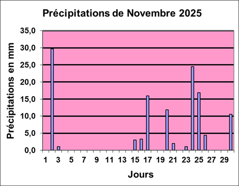 Remarques : Avec une moyenne de température de 4.0°C, à 0.4°C au-dessous de la moyenne calculée de 4.4°C depuis le début des mesures en 1997 et un cumul total de précipitations à 124.2mm/m2 sur 12 enregistrements, supérieur de 29.4mm au cumul moyen de 94.8mm calculé depuis 1997, ce mois fut un peu plus froid tout comme les 2 mois précédents et plus arrosé aussi comme les 2 mois précédents. L'automne météorologique s'est terminé par une température inférieure de 0.7°C à la moyenne des automnes météorologiques depuis 1997. Quant aux précipitations des 3 mois elles se situent à 143% au-dessus de la valeur calculée de tous les automnes météorologiques depuis 1997. A noter la situation particulière du mois de novembre. En date du 15 novembre, la moyenne de température était située à 3.5°C au-dessus de la norme et les précipitations à 30.8mm/m2 seulement. Bon nombre de jours ensoleillés durant la première quinzaine. Les températures des 15 derniers jours furent très nettement au-dessous de la norme et les précipitations nettement au-dessus. Entre le 20 et le 26, un cumul de neige de 40cm fut mesuré. Une période de 4 jours de Foehn avec une pointe enregistrée à 68.5km/h le 14 a contribué, presque à établir un nouveau record de température pour le mois de novembre enregistré à 17.2°C à 0.1°C du record de 2009 fixé à 17.3°C. Nettement moins de soleil les 15 derniers jours. A noter encore qu'à fin novembre le cumul de précipitations est presque égal au cumul annuel à fin décembre. |