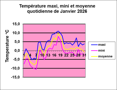 Remarques : Avec une moyenne de température de 0.6°C, à 0.7°C au-dessus de la moyenne calculée de -0.1°C depuis le début des mesures en 1997 et un cumul total de précipitations de seulement 45.6mm/m2 sur 9 enregistrements, inférieur de 44.5mm/m2 à la norme de 90.1mm/m2 calculée depuis janvier 1997, c'est à dire la 30ème année. Ce mois fut marqué par la présence du Foehn soufflant à plusieurs reprises dont 6 jours consécutifs, entre le 15 et le 20, avec des pointes dépassant le 70km/h faisant grimper les températures nettement au-dessus des normes pour janvier à cette station et, après décembre, trop sec malgré le cumul de 32cm de neige vite évaporés. A noter qu'après les 10 premiers jours la température moyenne était nettement au-dessous des normes. Les vents du sud ayant pris le pouvoir, la moyenne a rapidement franchi la barre du 0°C. Après 2 mois d'hiver météorologique, la température moyenne est nettement au-dessus de la norme et le cumul des précipitations atteignant péniblement le 30% de cette norme, de quoi se faire du souci pour les mois suivants surtout si la loi des compensations se met en place! |