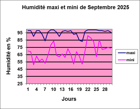 Remarques : Avec une moyenne de température de 12.9 °C, à 0.8°C au-dessous de la moyenne calculée de 13.7°C depuis le début des mesures en 1997 et un cumul total de précipitations à 164.3mm/m2 sur 14 enregistrements supérieur de 64.0mm au cumul moyen de 100.3mm calculé depuis 1997, ce mois fut généralement peu ensoleillé à l'exception de 5 jours entre le 17 et le 21. A noter que le 15, le cumul des précipitations de tout un mois de septembre était déjà atteint avec 101.6mm. Il s'agit du 4ème mois de septembre le plus arrosé après 1998, 2012 et 2024. A noter encore la température, dès le 22, toutes les valeurs enregistrées étaient situées à moins de 10°C. Ces valeurs ont fortement contribué à abaisser la moyenne mensuelle. Les vents d'origine polaire en sont la cause. Sur l'ensemble du mois, très peu de vents du sud furent enregistrés. |